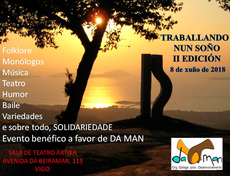 Evento solidario para recaudar fondos para Da ManEl próximo día 8 de junio, en la Sala de Teatro Ártika de Vigo, vamos a celebrar un evento benéfico a favor de la ONG DA MAN. Esta ONG desarrolla su actividad en Galicia con la población inmigrante, y en Senegal llevando a cabo diversos proyectos, fundamentalmente en los ámbitos educativo y sanitario. Es una entidad sin ánimo de lucro dedicada al trabajo solidario, la ayuda humanitaria y la cooperación en países en vías de desarrollo. El objetivo de DA MAN, en colaboración con organismos, instituciones y profesionales, es contribuir al desarrollo humano y al fortalecimiento de los derechos fundamentales de las personas en situación más vulnerable. En este acto benéfico queremos recaudar fondos para que miembros de la ONG puedan desplazarse a Senegal y llevar a cabo operaciones de cataratas. Allí los afectados con este problema ocular están prácticamente ciegos al no disponer de los mínimos medios económicos para solucionar esta grave afección, lo cual aumenta las penurias del núcleo familiar. Muchas personas caminan cientos de kilómetros para poder ser operadas. En "Traballando nun soño" vamos a actuar personas aficionadas a la música, el humor, el teatro, el baile, etc. En total, 150 espectadores asistirán a este evento de modo gratuito y aportarán de forma altruista el donativo que deseen. Se creará también una fila cero, para que todos aquellos que no puedan asistir al acto y quieran colaborar, tengan oportunidad de hacerlo.